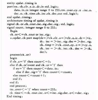 VHDL硬件描述语言是IEEE国际工业标准,具有描述能力强、可以与工艺无关、易于共享与复用等特点。多VHDL语言以及MAXPLUSⅡ平台的。根据以上原理设计VHDL代码,总体分为3个功能模块:加法器模块、时钟校正模块以及定时模块。